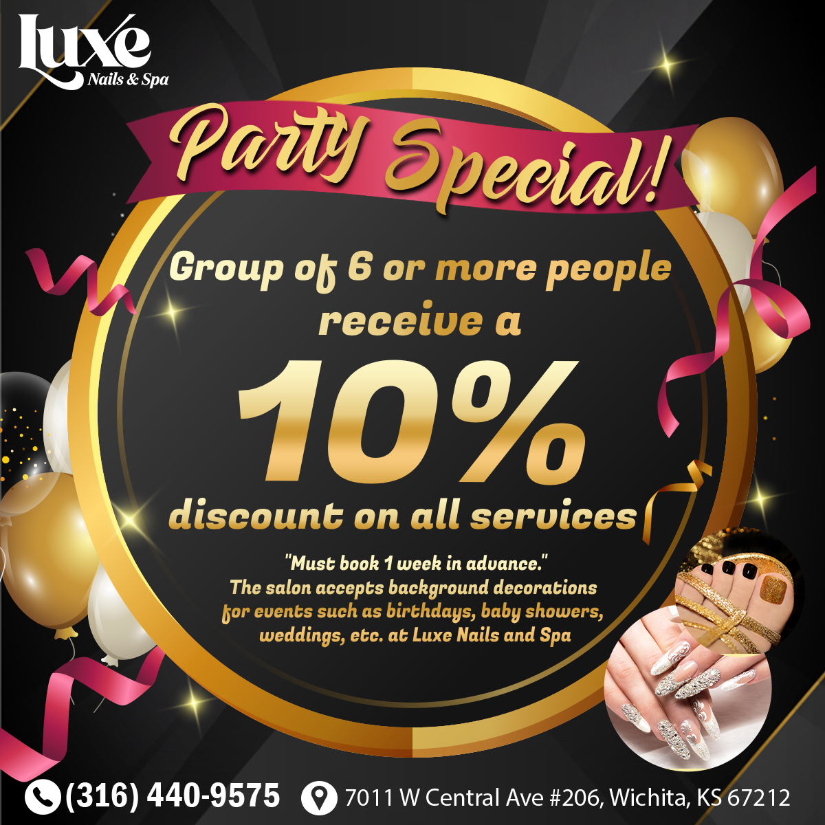 Luxe Nails & Spa is one of the best nail salons located in Wichita, KS 67212. Our philosophy and mission are to ensure that customers are happy when they come and satisfied when they leave. Come to visit our nail salon, you’re ensured to experience the best services at a reasonable price as well as an airy and clean space. Here we provide the best services for our valued customers such as Manicures, Pedicures, and Waxing. With many years of experience, we deeply understand almost customer's needs, so we always make a great job to satisfy all our valued customers when using any service.